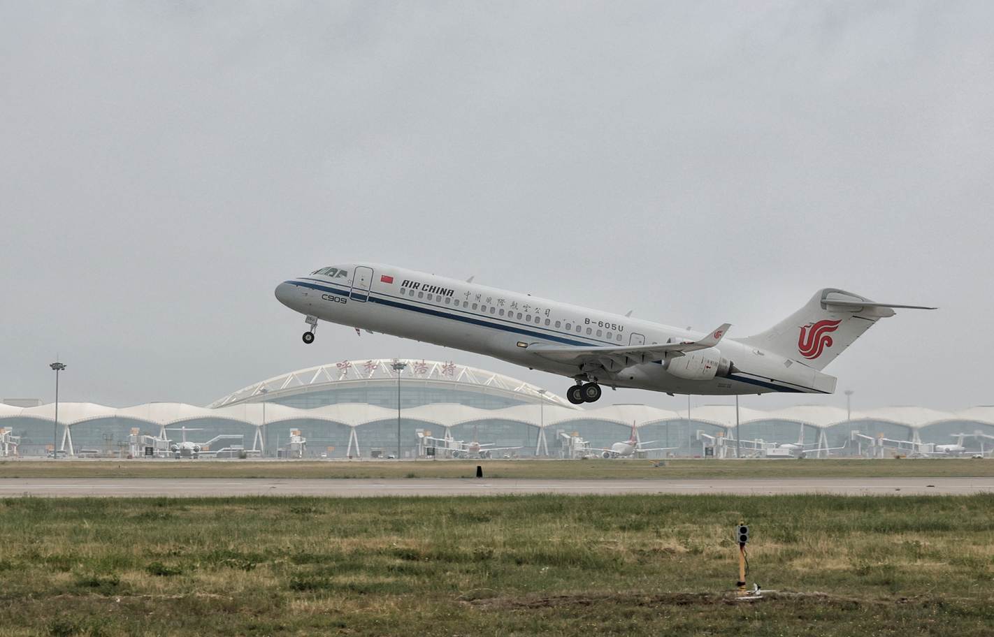7月1日8时许,首架载旗C909机型国际商业航线航班CA757从呼兰浩特白塔机场起飞。陶冉 摄