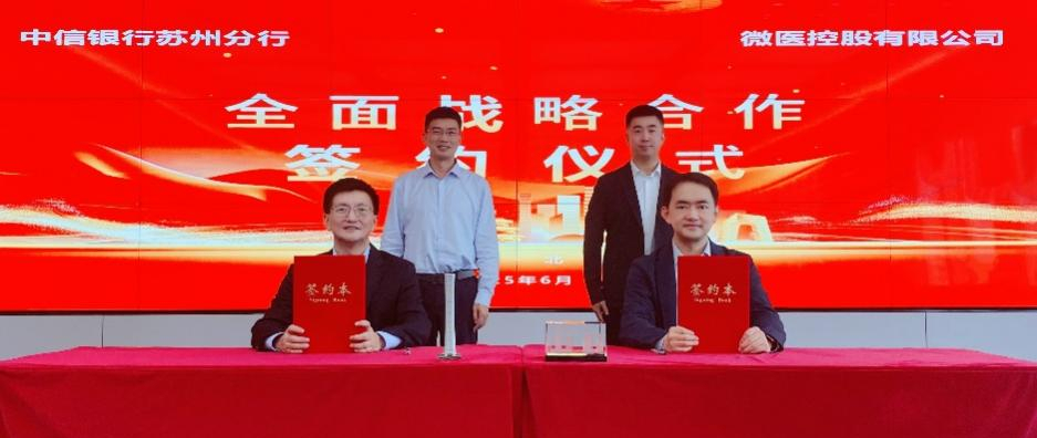6月30日,AI医疗领军企业微医控股与中信银行苏州分行在北京中信大厦签署战略合作协议。双方将深度融合金融与科技力量,共同加速AI健共体的全国推广,致力打造更高质量、更高效率、更加公平且可持续的国民健康服务体系。中信银行苏州分行作为牵头行,已协同天津、杭州、海口、银川四地分行率先与微医控股开展深度合作落地。