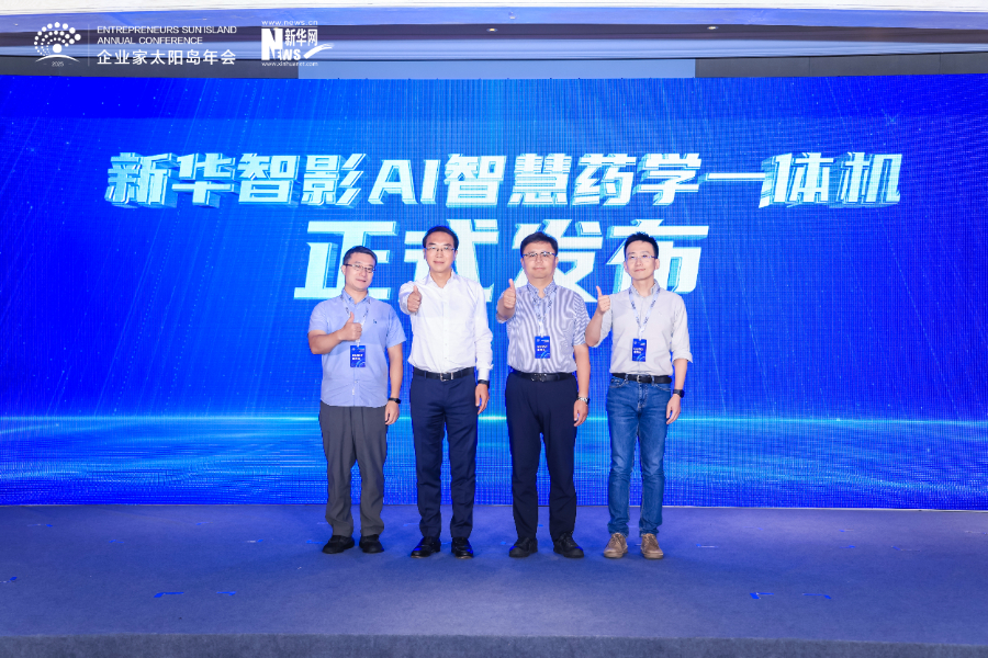 图为“新华智影AI智慧药学一体机”发布仪式。新华网首席运营官孙巍(左二)、中国海洋大学医药学院副院长李德海(左一)、山东第二人民医院药学部主任吴记勇(右二)、智影科技董事长唐雨(右一)共同发布。新华网发