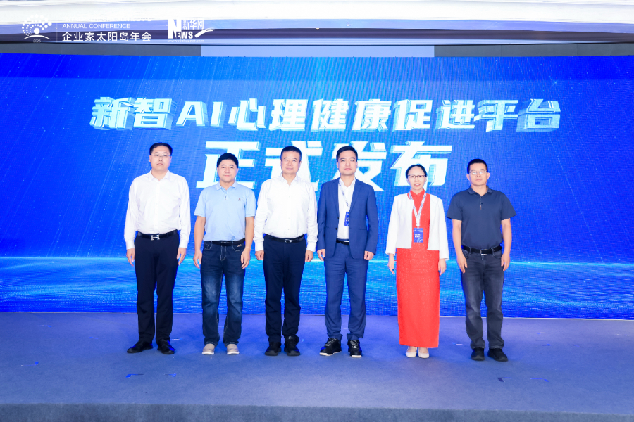 图为“新智AI心理健康促进平台”发布仪式。新华网首席信息官姚予疆(左三),上海市心理学会员工心理促进工作委员会主任、教授毕玉芳(右二),清华大学集成电路学院与轩任联合研发负责人王光奇(左二),上海轩任科技集团创始人兼CEO刘祖光(右三),上海轩任科技集团董事长李克俭(左一),北京聚信成众董事长李永清(右一)共同发布。新华网发