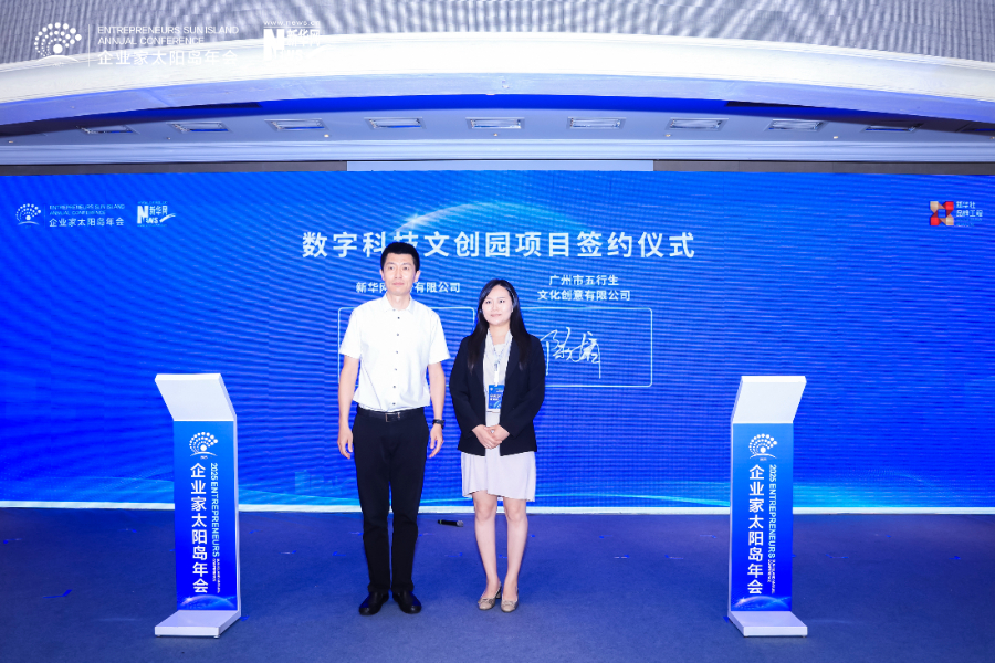 新华网数字经济事业中心常务副总经理张涛(左一)与广州市五行生文化创意有限公司总经理陈婧(右一)进行签约。新华网发