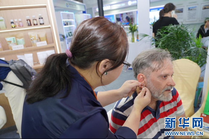 外国友人在厦门市中医院展区体验耳穴埋豆