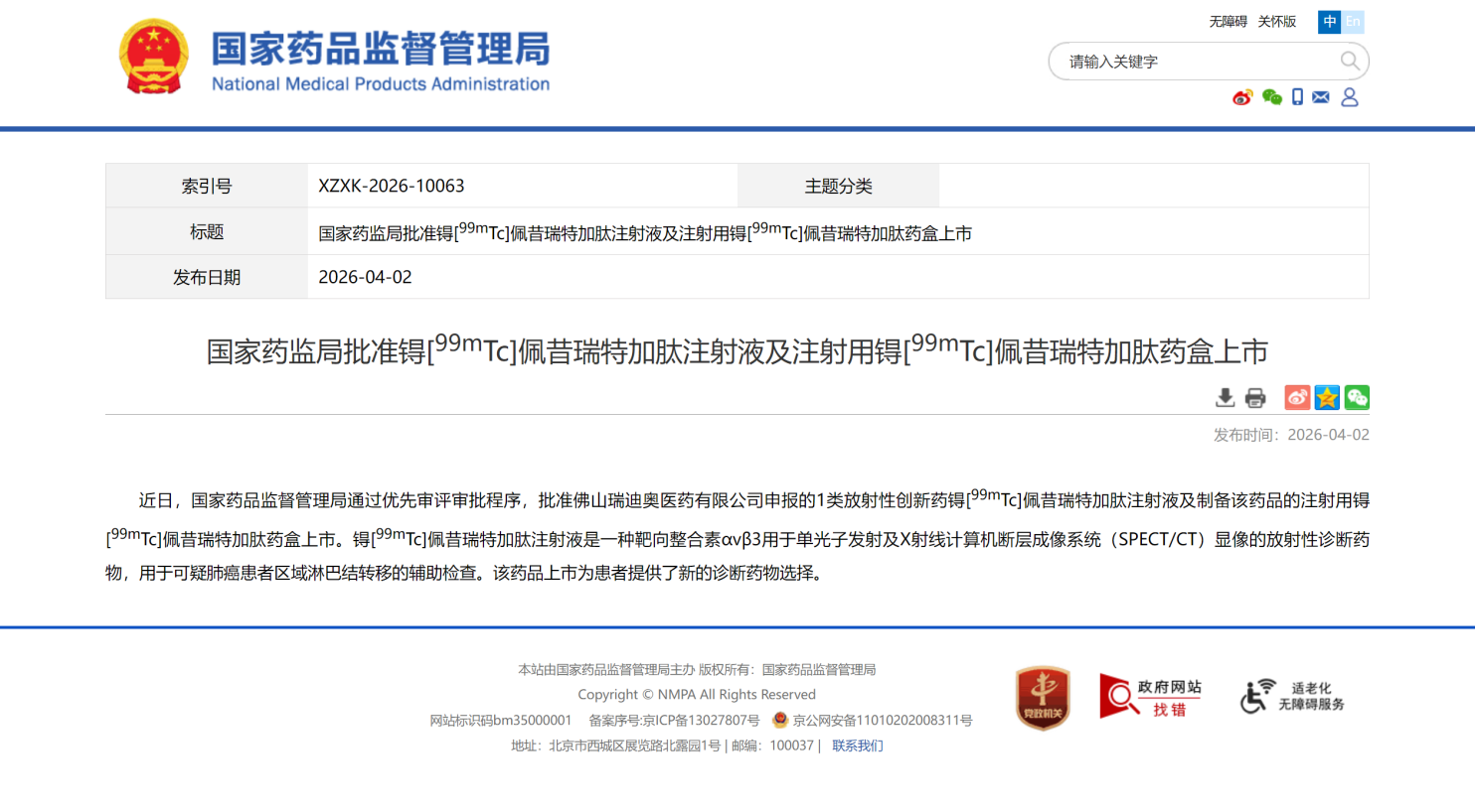4月2日,百洋医药集团投资孵化的核医学创新企业——佛山瑞迪奥医药有限公司(北京吉伦泰医药有限公司控股子公司)申报的1类创新核药锝99mTc佩昔瑞特加肽注射液(99mTc-3PRGD2,商品名:吉伦泰)及制备该药品的注射用锝99mTc佩昔瑞特加肽药盒正式获得国家药品监督管理局(NMPA)批准上市。作为中国自主研发的1类创新核药、用于SPECT显像的广谱肿瘤显像剂,99mTc-3PRGD2的获批不仅标志着中国核医学药物自主研发从0到1的重大突破,更是从“跟跑”向“原创领跑”的重大跨越。