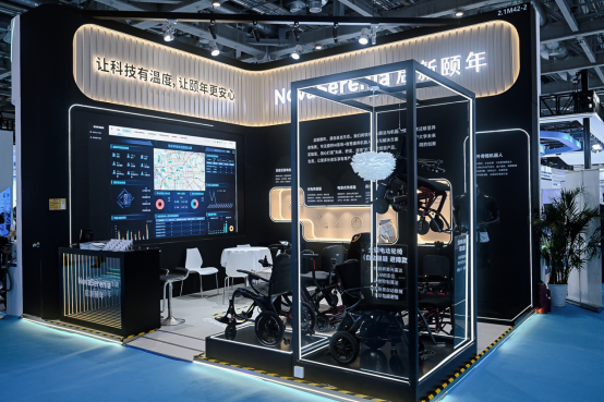 作为首次亮相行业盛会的新锐力量,启新颐年以“技术底座+产品矩阵+场景落地”为主线,系统展示了其在智慧康养领域的综合能力。展位以黑金色为主色调,极具科技感,现场通过系统视频完整呈现了AI+智慧康养解决方案在居家、社区及机构中的真实服务场景。展品涵盖全碳纤维电动轮椅、外骨骼机器人、AI情感陪伴机器人,以及智能助浴机器人、智能二便护理机器人的核心零部件,清晰勾勒出覆盖助行、助浴、助便、助康等场景的产品矩阵。其中,高速无刷电机、光电传感器、电容式传感器等自研核心部件,集中体现了启新颐年从底层算法到新材料应用的全栈技术能力。