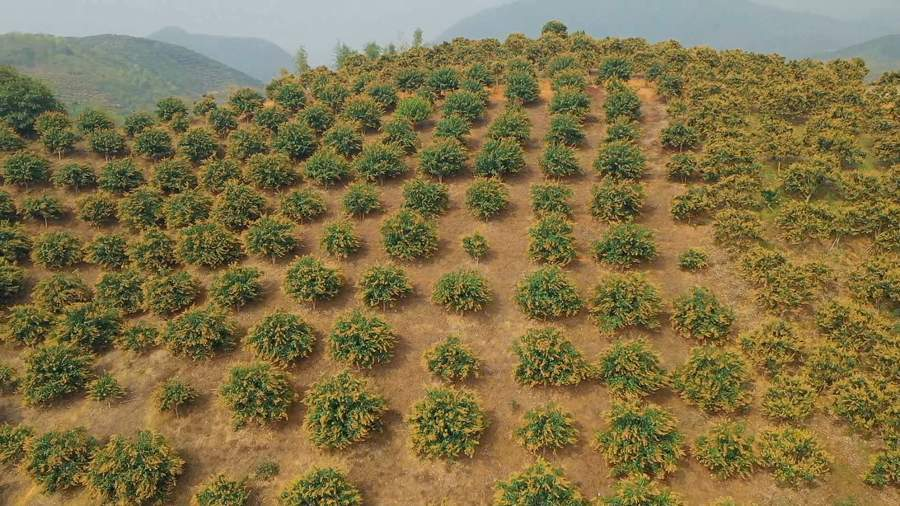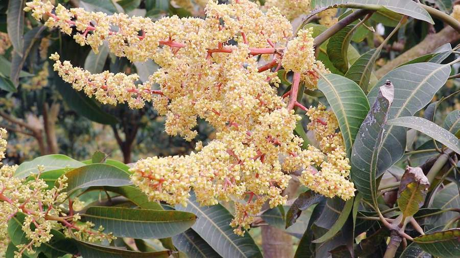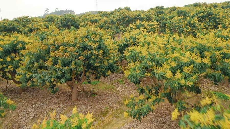 连日来,在广西百色右江区四塘镇六合村的全国“一村一品”芒果示范基地里,这里的17800多亩芒果树正开着淡黄色的小花。