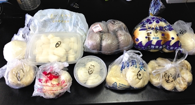 昨日,记者从菜市场、超市等场所购买的包子和馒头样品。