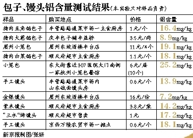 10个样品中,有9个样品的铝含量值都在20mg/kg以内,来自庆丰包子铺丰益桥的猪肉大葱馅包子、眉州东坡酒楼丰台店的金银馒头铝含量最少。只有一家“杭州小笼包”的小笼包,铝含量25.2mg/kg。不过,这距离国家规定的100mg/kg铝限量值,还是相差较远。