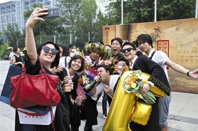 昨日,北大邱德拔体育馆外,毕业生们和亲朋好友合影留念。当天,北京大学举行2014年本科生毕业典礼暨学位授予仪式。本版摄影/新京报记者 周岗峰