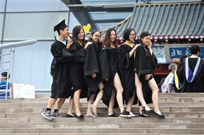 毕业典礼结束后,学生在北大邱德拔体育馆外合影留念。