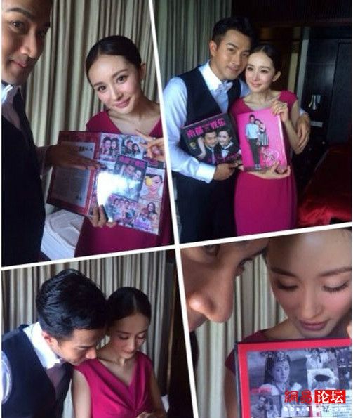 杨幂身穿一身玫粉色深V连衣裙,刘恺威一身绅士风打扮,两人甜蜜相互依偎在一起,手中拿着两本杂志。其中第四张图片我们还能看到杂志中,杨幂和刘恺威过去的剧照。这对新人的幸福与甜蜜溢于言表。