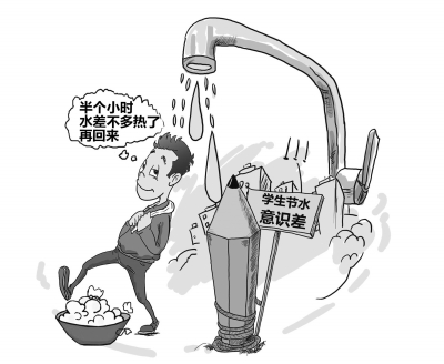某高校澡堂,一些大学生洗澡前放水半个小时,在洗澡中间一直开着水龙头等浪费现象并不罕见,白白浪费了很多水。(7月1日《北京晨报》)