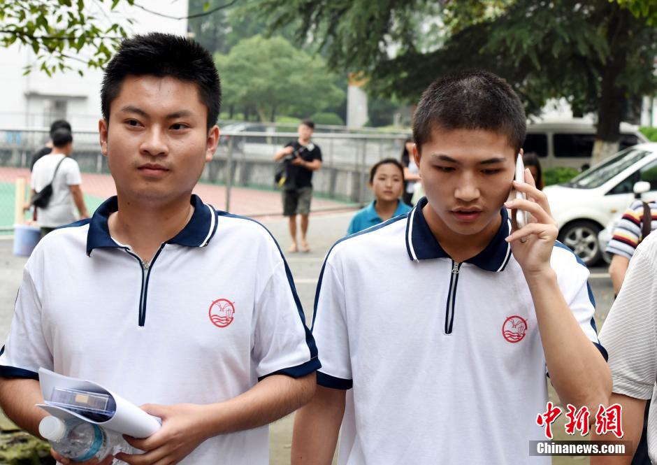 7月3日,江西“夺刀少年”柳艳兵(右)、易政勇走出考场,一起回宿舍。当天下午17时,江西宜春三中2014年普通高校招生全国统一考试(单考)袁州考区三中考点,随着最后一堂英语考试结束的铃声响起,柳艳兵 、易政勇结束了自己的高考之旅。走出考场的两人面带笑容,精神不错。当被问起考完后两人最想做的事是什么时,两人的回答出奇的一致,就是想好好休息。中新社发 刘继刚 摄