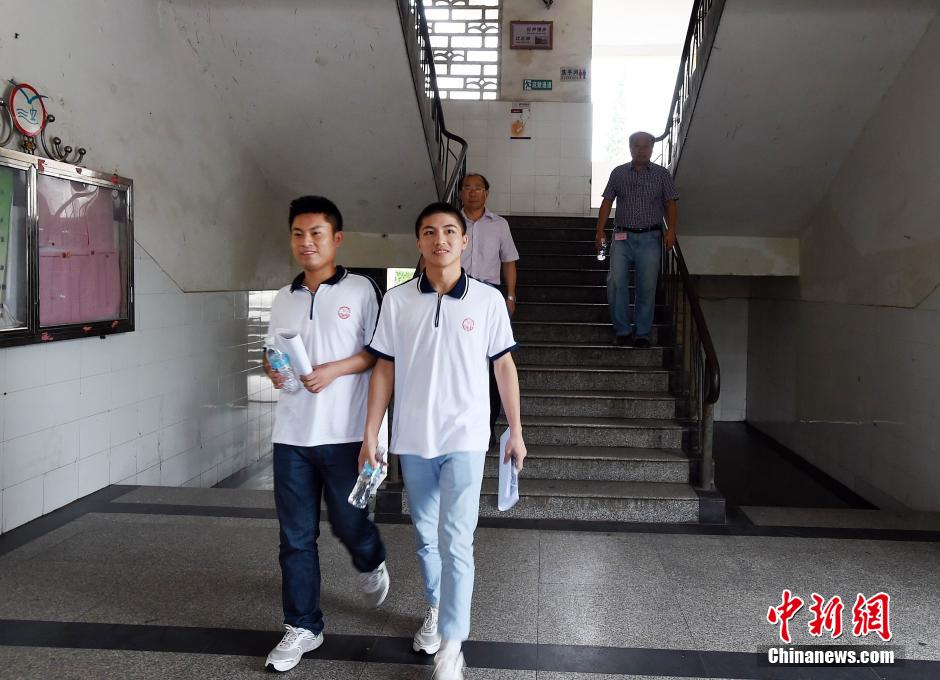7月3日,江西“夺刀少年”柳艳兵(右)、易政勇(左)面带笑容走出考场。当天下午17时,江西宜春三中2014年普通高校招生全国统一考试(单考)袁州考区三中考点,随着最后一堂英语考试结束的铃声响起,柳艳兵 、易政勇结束了自己的高考之旅。走出考场的两人面带笑容,精神不错。当被问起考完后两人最想做的事是什么时,两人的回答出奇的一致,就是想好好休息。中新社发 刘继刚 摄