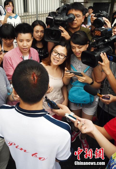 7月3日下午,江西宜春三中2014年普通高校招生全国统一考试(单考)袁州考区三中考点,江西“夺刀少年”柳艳兵在考后接受采访。从背后看,重伤初愈的柳艳兵头上的伤口清晰可见。今年5月31日,在江西宜春市区至金瑞镇的一辆公交中巴车上,一名歹徒用菜刀将包括高三学生柳艳兵、易政勇在内的车上5名乘客砍伤。二人与歹徒进行了搏斗,柳艳兵更不顾自身被砍剧痛,上前夺下歹徒手中的凶器。事发后,二人因负伤憾失高考,被誉为“最美考生”,成为“中国好人榜”候选人,柳艳兵更被授予全国首个“见义勇为楷模”称号。中新社发 刘继刚 摄