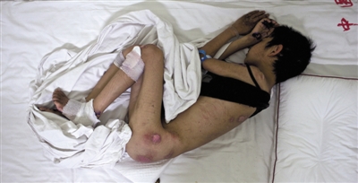 小童因难以忍受剧烈头痛刚打完镇静剂,躺在病床上休息。9岁女孩小童在赴北京学国学过程中,遭到“老师”殴打虐待。