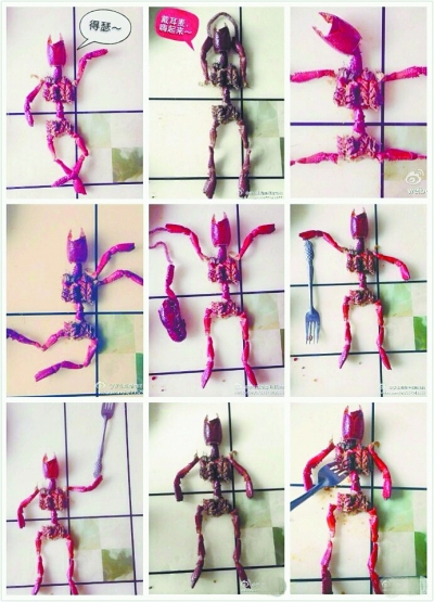 王小姐告诉记者,之前她吃完螃蟹和虾子,觉得它们的壳子很有立体感和创意感,也会随手摆几个造形,但没有像这次这样摆出一个系列来,而且近来刚看完电影《变形金刚4》,脑海里还常常晃动着他们的形象,因此抬手就摆出几个变形机器人的动作。