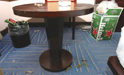 前天中午,记者随清洁人员走进一间尚未打扫的复式套房,只见地上散落着烟头和啤酒瓶,随意扔在卫生间地板上的浴巾和毛巾看上去很脏。