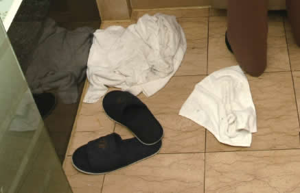 在江心西园海景大酒店内,浴巾、毛巾随意丢在地上。