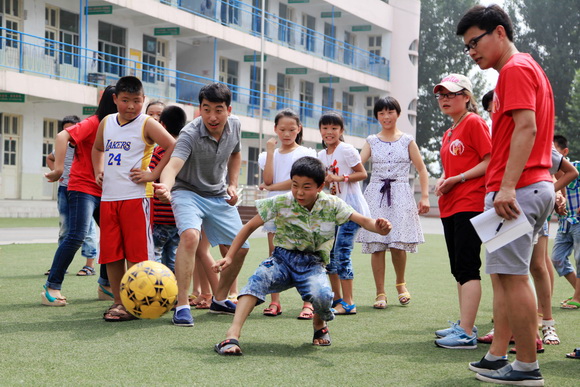 原来,上海市委党校支教团的老师们正在带领孩子举办趣味运动会。