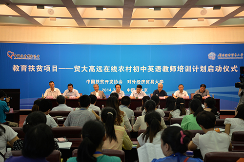 2014年7月21日,由中国扶贫开发协会与对外经济贸易大学联合举办的教育扶贫项目——“贸大高远在线农村初中英语教师扶贫培训计划”启动仪式在对外经济贸易大学诚信楼三层国际会议厅举行。出席启动仪式的领导有:中国扶贫开发协会副会长、港澳台侨委员会原主任、国务院侨办原主任郭东坡、中国扶贫开发协会副会长、外经贸部原副部长、香港华润集团公司原董事长谷永江、教育部教师工作司副司长葛振江、对外经济贸易大学副校长刘亚、继续教育学院院长曾钢、对外经济贸易大学原副校长、贸大高远在线教学指导委员会主任黄震华、对外经济贸易大学云南勐腊县挂职副县长李卫刚、陕西榆林市教育局副局长韩春明。参加启动仪式的还有:中国扶贫开发协会办公室副主任侯孔莉、对外经济贸易大学继续教育学院党总支书记崔鑫生、副院长胡建生、副书记王新、副院长史希红等。