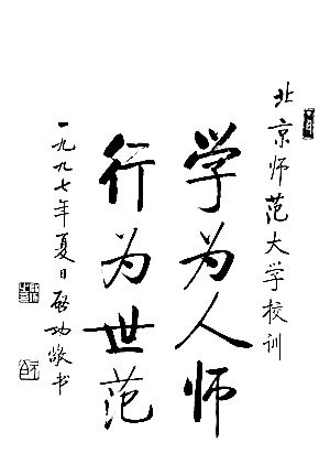 校训简约义达。赵仁珪教授至今仍记得:起初,学校曾邀请校内很多专家学者共提方案,启功自己也拟出不同训词,但最后敲定“学为人师 行为世范”八字,显得平易通畅且深刻含蕴。它不但紧扣“师范”二字,而且包含了学与行,理论与实践,做学问与做人,做一般人和做老师等之间的辩证关系。