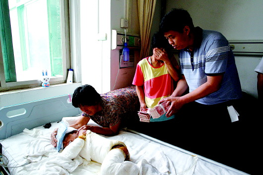 本来在外屋玩的小梦君来到厨房找爷爷,“别到这屋来,到外面玩去。”爷爷对她说。谁知小梦君往后一退,正好摔到了那一锅刚烧好的热水中。“哇”的一声,梦君撕心裂肺地哭喊起来,在一旁做饭的爷爷赶忙将孙女从锅里捞出来。