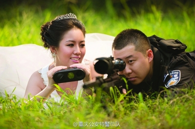 在婚纱照里体现自己的职业,这样的个性创意被很多人采用。各种有特色的婚纱照,让人肃然起敬。昨天,一组特警的婚纱照网络走红,引来很多人关注。照片中的男主角是重庆29岁的特警队员侯卫林,他因为工作抽不出身,所以在结束一天的训练后,穿着警服,和换上婚纱的妻子,在训练场里拍下了这些照片。网友纷纷转载并送上祝福。