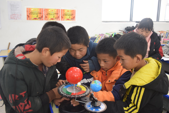 为民小学学生在观察三球仪。