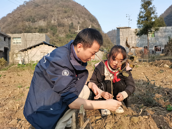 华中农业大学研支团志愿者与学生一起种植苹果柿树苗。