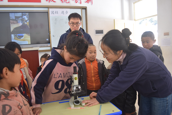 华中农业大学研支团志愿者教学生们使用显微镜。