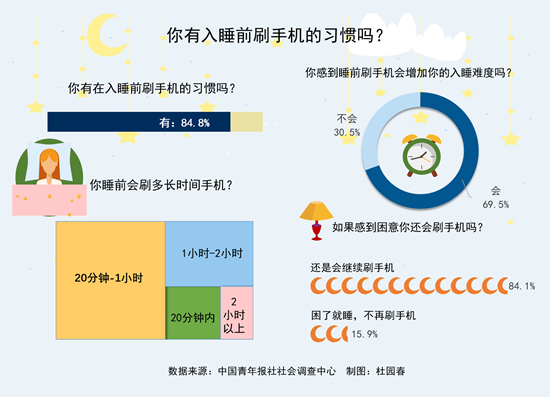 调查显示,84.8%的受访青年都有睡前刷手机的习惯。即便感到困意,84.1%的受访青年还是会继续刷手机。69.5%的受访青年直言睡前刷手机会增加入睡难度。