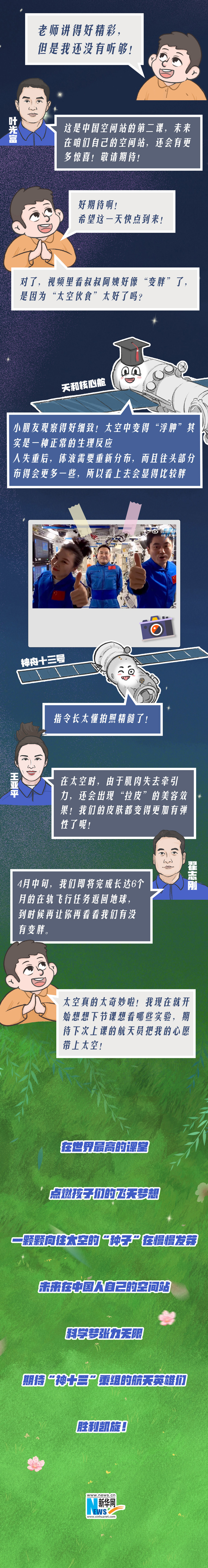 “天宫课堂”又开讲啦!“感觉良好三人组”为地球上的孩子们设置了丰富有趣的课程,讲解了别开生面的太空知识。太空“冰雪”实验,水油分离实验,你好奇的这里都有!什么?你没来得及进直播间听课?没关系,贴心的课代表新华网用创意手绘回顾了精彩瞬间,为大家奉上“宇宙最强”网课笔记!快点一起上课吧!