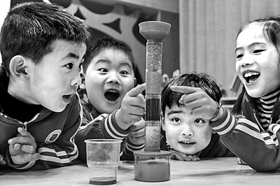 3月21日,浙江省湖州市长兴县水口乡中心幼儿园的小朋友正在做“水变干净啦”小实验。许斌华摄/光明图片