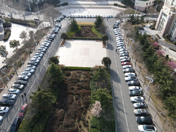 4月4日,中国海洋大学崂山校区,参加研究生招生复试工作的专家和工作人员的自驾车辆经过消杀后,在封闭区域停放。此时,青岛的高校正处于封闭管理状态,专家和工作人员需提供3天3次核酸检测阴性证明,途中做到“两点一线”,做好个人防护,不乘坐公共交通工具。中国海洋大学供图