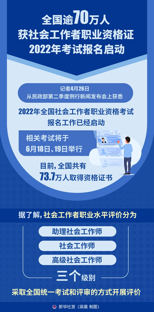 新华社北京4月26日电(记者高蕾)记者26日从民政部第二季度例行新闻发布会上获悉,今年全国社会工作者职业资格考试报名工作已经启动,相关考试将于6月18日、19日举行。目前,全国共有73.7万人取得资格证书。