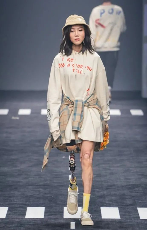 牛钰踩着假肢走上T台