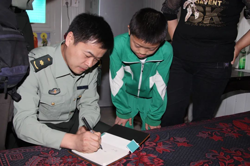 一位解放军叔叔送他笔记本、水彩笔