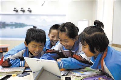 ①宁夏彭阳县第四小学学生通过智慧平板与乡村学校学生互动。学校供图