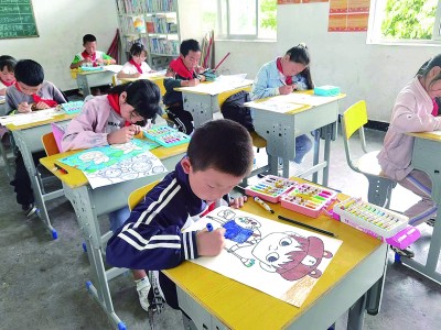 四川雅安市芦山县龙门乡隆兴中心校学生在绘画创作。周梦雯摄/光明图片