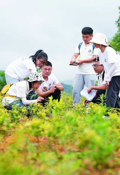 江西省新余市分宜县湖泽镇乡村茶叶种植基地,华东交通大学的学生们在实地调研。赵春亮摄/光明图片