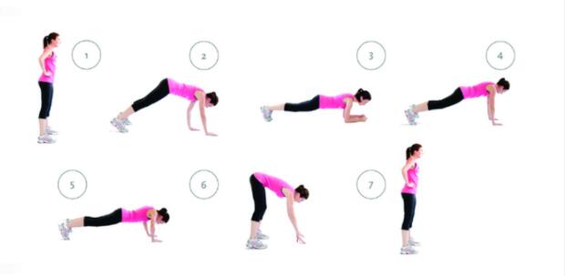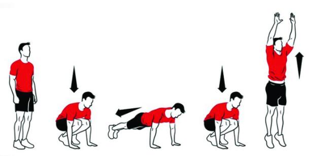 这个练习可以锻炼上肢和下肢力量以及心肺耐力。首先,保持站立姿势;然后下蹲,手掌撑在地板上,双腿后蹬再收回;双腿收回的同时,向上跳起,同时双手尽力上举;然后重复这个过程即可。