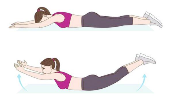这个练习可以增强下背部、臀部和核心力量。首先呈俯卧位,手臂和腿都保持伸展;然后慢慢地将手臂和腿抬离地面,尽可能抬高,同时保持颈部放松并向下看地面;想象自己像超人一样,保持一两秒再回到起始位置。