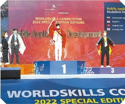 杨书明登上2022年世界技能大赛特别赛移动应用开发项目金牌领奖台。受访者供图