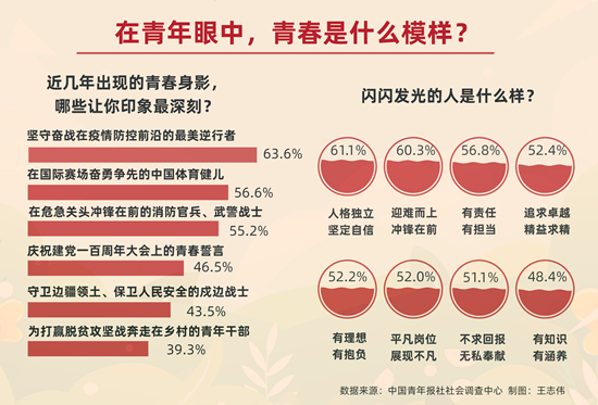 从抗击新冠肺炎疫情中写下请战书的年轻医护人员,到用生命守卫边疆领土的青年战士,再到奔赴祖国最需要地方的大学生志愿者,新时代的青年在用实际行动践行着“请党放心、强国有我”的青春誓言。近日,中国青年报社社会调查中心联合问卷网(wenjuan.com)进行的“青春之力调查”显示(3210名青年参与),过去几年中出现的青春身影,最令受访青年印象深刻的是坚守奋战在疫情防控前沿,彰显人民至上、生命至上的最美逆行者。在青年眼中,什么样的人是闪闪发光的?61.1%的受访青年认为是人格独立、坚定自信,60.3%的受访青年觉得是迎难而上、冲锋在前。超七成受访青年认同“我的样子就是中国的模样”,仅5.3%不认同。