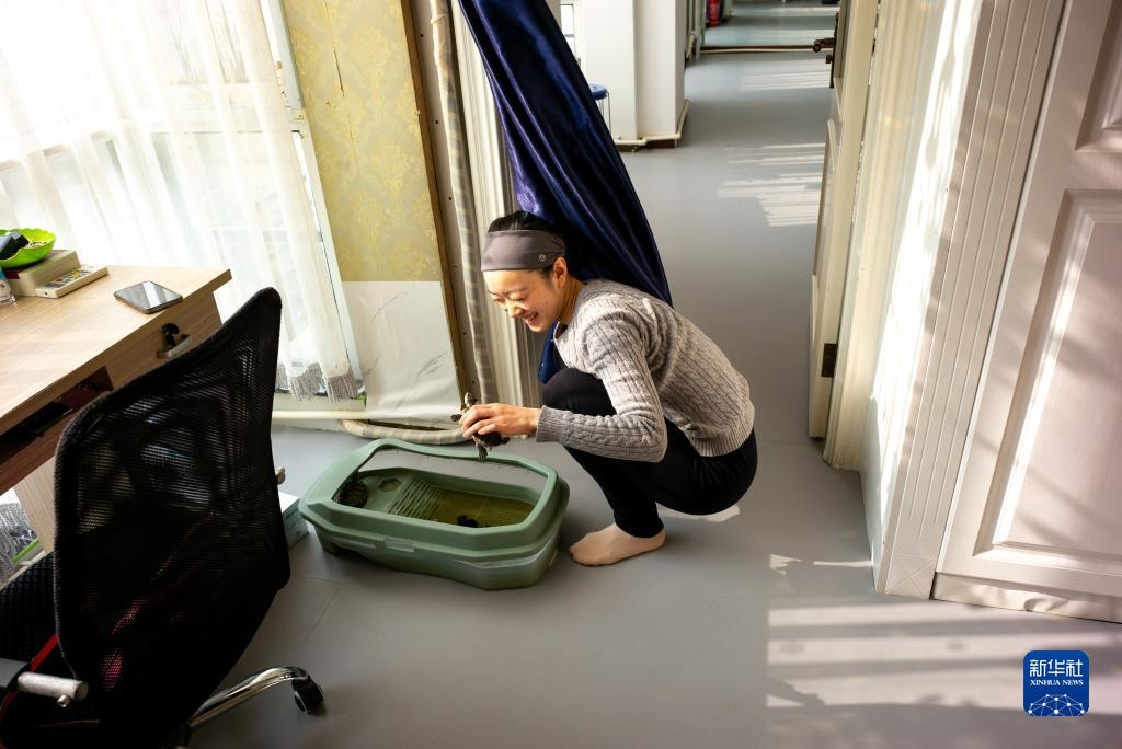 11月8日,在北京家中的舞蹈教室,宠物龟从龟缸里爬了出来,赵蕴辉捉住这个“顽皮”的家伙,开心地笑了起来。 新华社记者 刘金海 摄