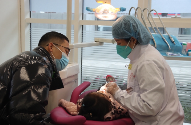 成都市金牛区妇幼保健院医护人员正和家长交流孩子口腔检查情况。但科谛 摄