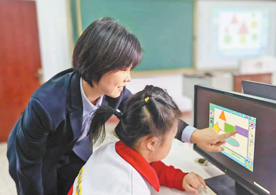 图为闫蕊(左)在教学生识别图案。(记者 李 蕊摄)