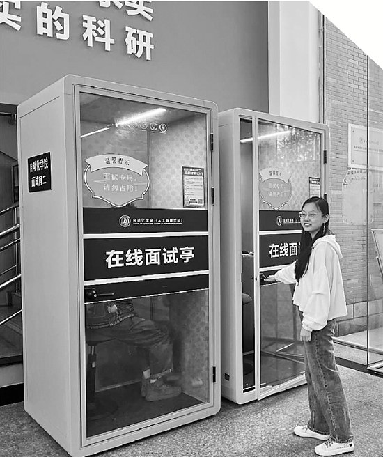 “我今年参加了好几个求职面试,现在企业百分之八十的面试要求线上,幸亏学院给我们打造了求职‘面试亭’,免费用,也很好预约,线上面试大多在学校面试亭里进行,隔音免打扰,是极佳面试环境。”该校自动化学院大四学生刘梦宜说。