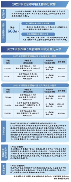 当天,东城区、西城区教委分别发布《关于开展2023年普通高中登记入学试点工作的通知》,东城区的北京市第二十一中学、北京市第五十中学分校以及西城区的北京市第五十六中学、北京市宣武外国语实验学校、北京市西城职业学校(附设普通高中班)5所学校为试点学校。