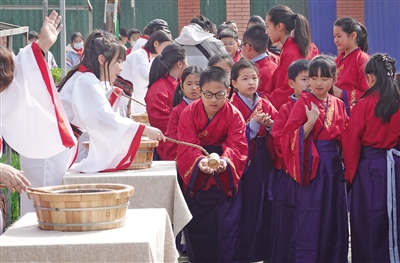 3月29日,北京十一学校丰台小学,身穿汉服的教师为小学生们“净手”。